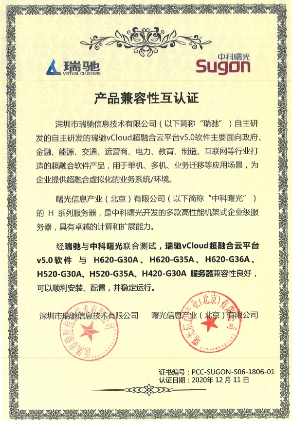 近日,瑞馳與中科曙光完成產(chǎn)品兼容性互認(rèn)證。經(jīng)測試,瑞馳vCloud超融合云平臺V5.0軟件與中科曙光H620-G30A、H620-G35A、H620-G36A、H50-G30A、H520-G35A、H420-G30A服務(wù)器兼容性良好。瑞馳平臺可以在曙光服務(wù)器上順利安裝、配置,并運(yùn)行良好。在瑞馳平臺+曙光服務(wù)器構(gòu)建的虛擬化、私有云、混合云環(huán)境中,多種應(yīng)用可長時(shí)間穩(wěn)定運(yùn)行,瑞馳平臺在物理資源管理,系統(tǒng)彈性擴(kuò)展,高可用等方面表現(xiàn)出色。